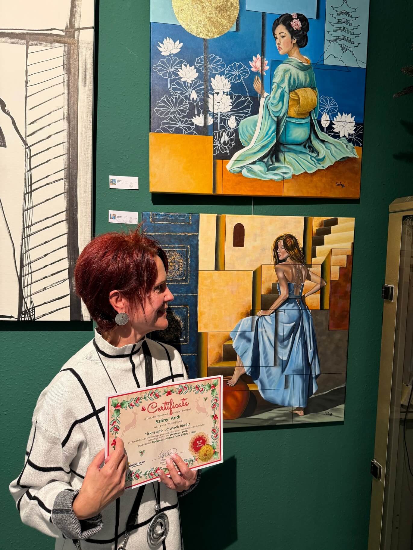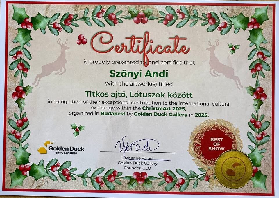 A budapesti Golden Duck Galéria „ChristmART” kiállításán a Titkos ajtó és a Lótuszok között című festményeim elnyerték a galéria Best of Show díját.