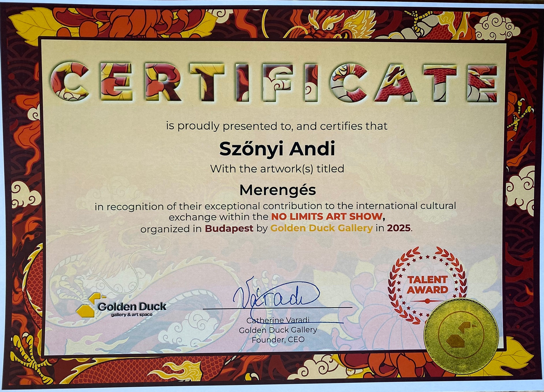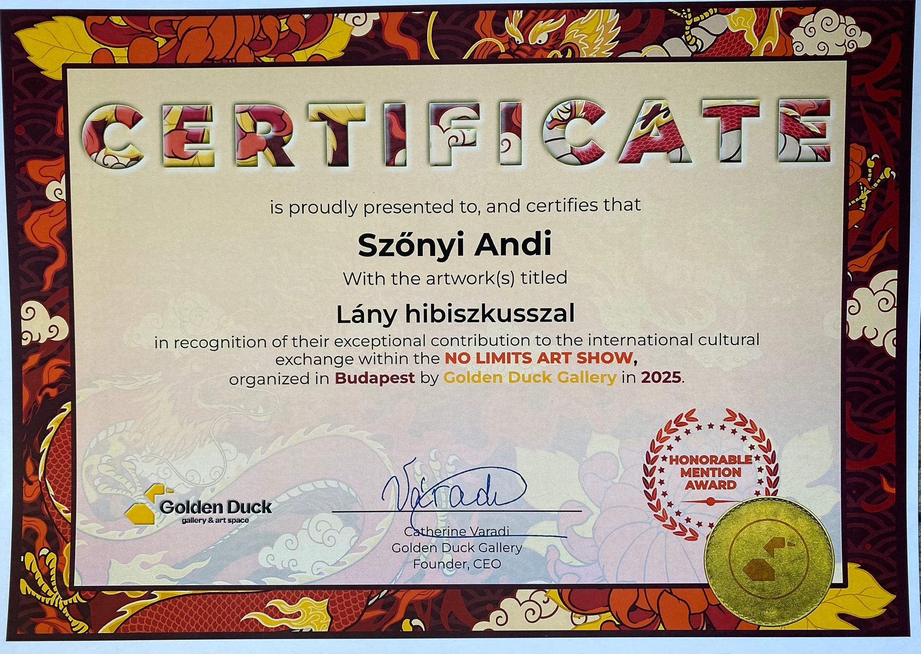 2025.10.06.  A budapesti Golden Duck Galéria „No limits” kiállításán a Merengés című festményem Talent Award-ot, a Lány hibiszkusszal című festményem pedig Honorable Mention Award-ot kapott.